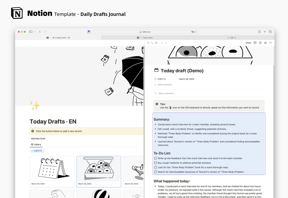 Introducing Daily Drafts Journal, a lightweight Notion Template designed to swiftly capture and organize your daily inspirations with the power of voice input and AI. No more losing brilliant ideas while driving or walking -- simply speak them into Notion, and let Notion AI handle the rest.