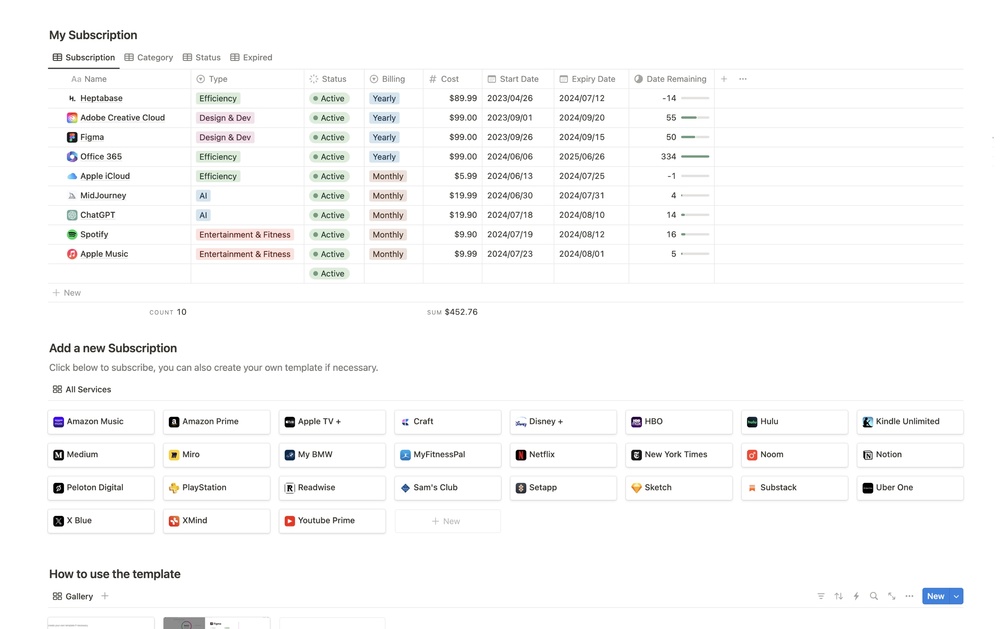 Fill in the expiration date of the subscription service, and the template will automatically calculate the remaining duration and subscription status. You can also set reminders to renew (or cancel) your subscription before it expires via Notion.